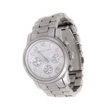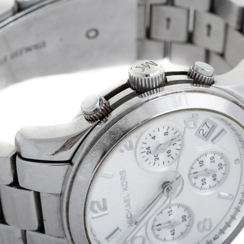 Relógio da marca Michael Kors, tamanho 4 cm de diâmetro. Confeccionado em metal prateado, com fecho por meio de encaixe. Encontra-se em bom estado de conservação, com leves desgastes de uso e vidro com riscos.