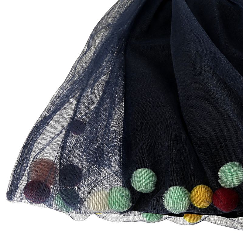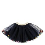 Saia da marca Billieblush Infantil. Confeccionada em tule azul marinho e pompons coloridos na ponta com cintura de elástico prateado. A peça se encontra em ótimo estado, com levíssimas marcas de uso.