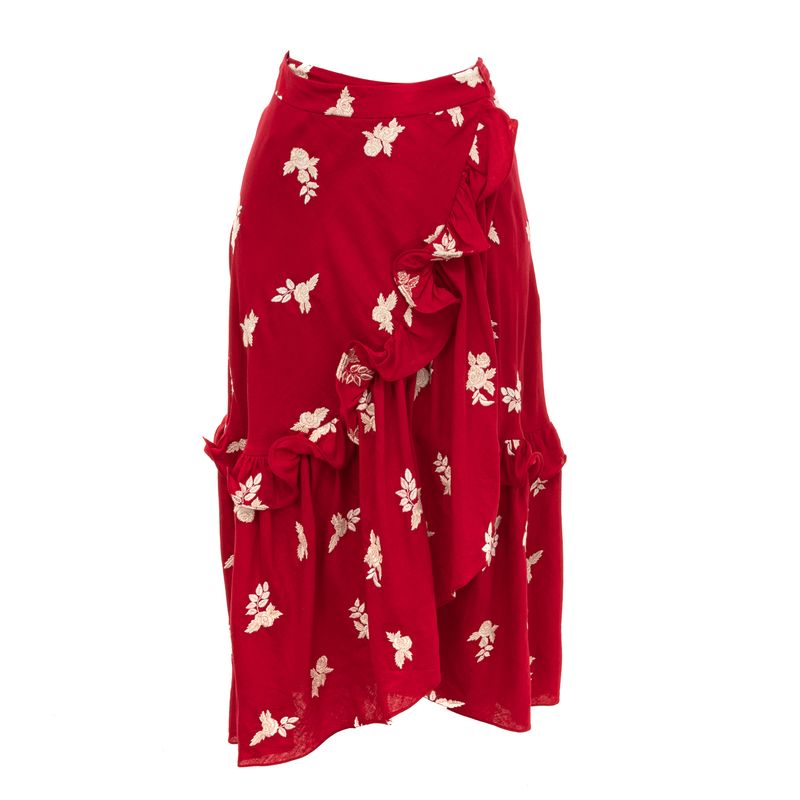 Saia da marca Cris Barros, edição limitada da coleção 20 voltas ao sol. Confeccionada em linho e viscose na cor vermelha com bordados brancos. Modelo midi, transpassado com fecho de amarração. A peça se encontra em excelente estado, muito bem conservada.