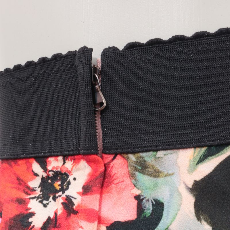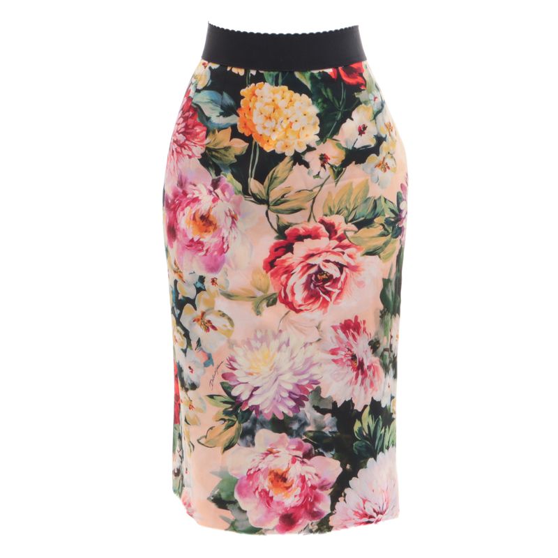 Saia da marca Dolce & Gabbana. Confeccionada em viscose e elastano na estampa floral, e barrado preto de gorgurão na cintura. Modelo midi com fecho de zíper na parte posterior. A peça se encontra em ótimo estado, com levíssimas marcas de uso, alguns fios puxados.