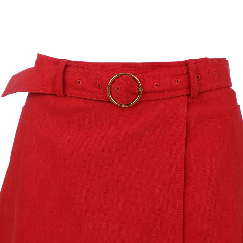 Saia da marca NK. Confeccionada em tecido vermelho transpassado, com dois bolsos na frente, cinto e fecho por meio de zíper na parte de trás. A peça se encontra em ótimo estado, com levíssimas marcas de uso.