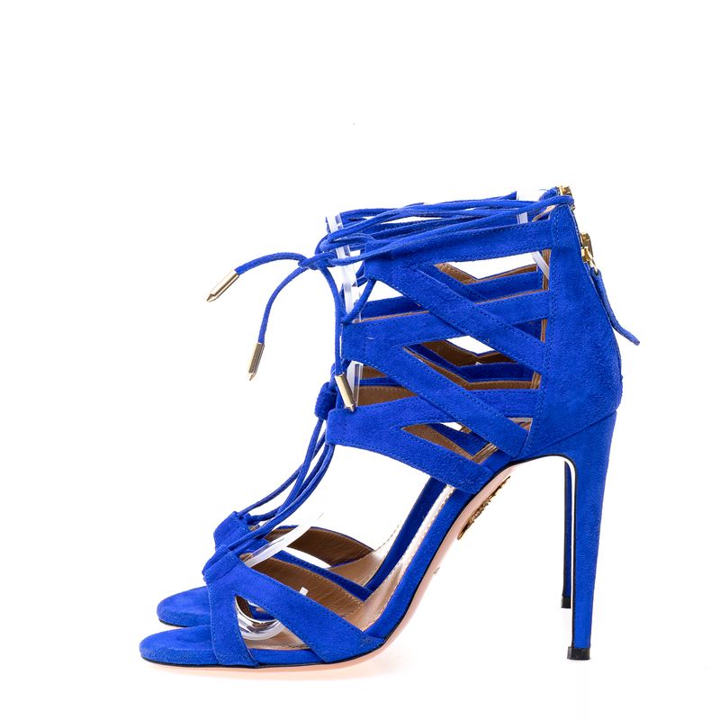 Sandália da marca Aquazzura. Confeccionado em camurça na cor azul, detalhe de recorte vazado, amarração frontal, zíper no calcanhar. A peça se encontra em estado satisfatório, com leves marcas de uso aparentes.