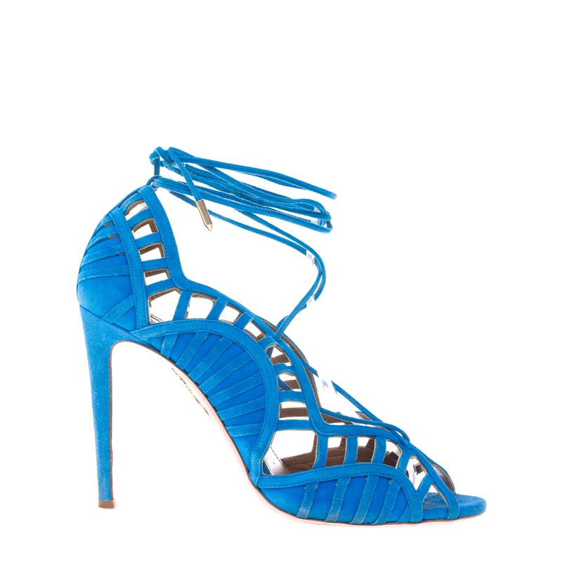 Sandália da marca Aquazzura. Confeccionada em camurça azul. A sandália conta com fecho por meio de amarração. A peça contém marcas de uso na sola, no salto e na camurça.