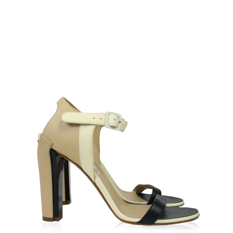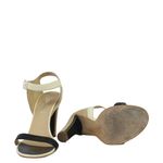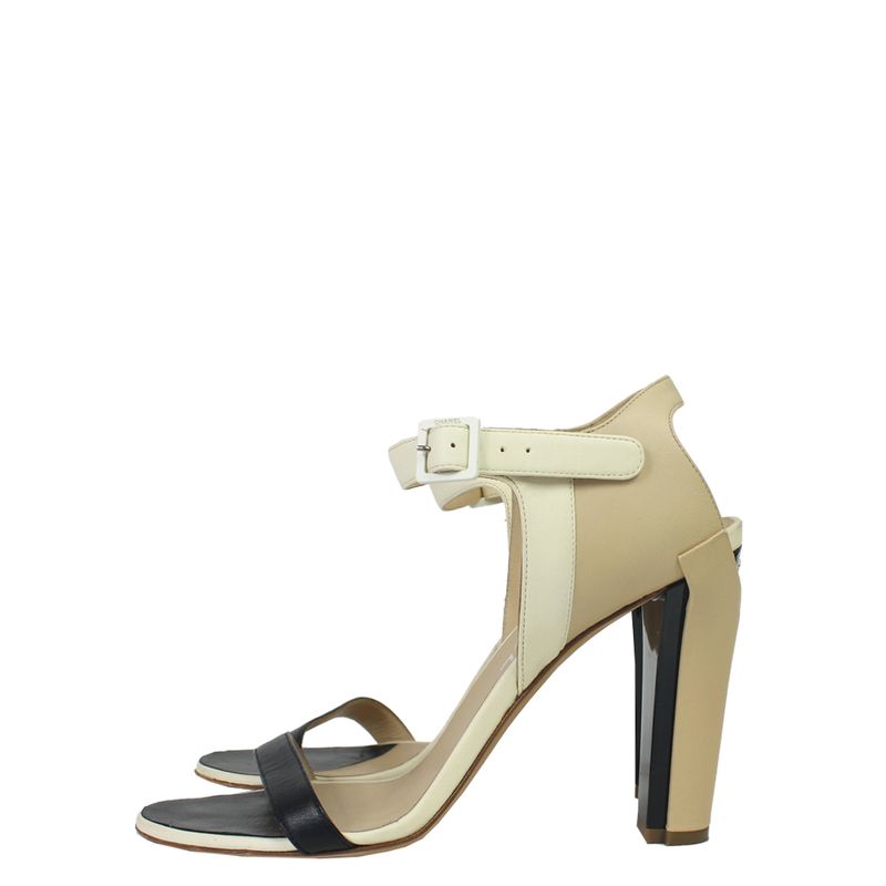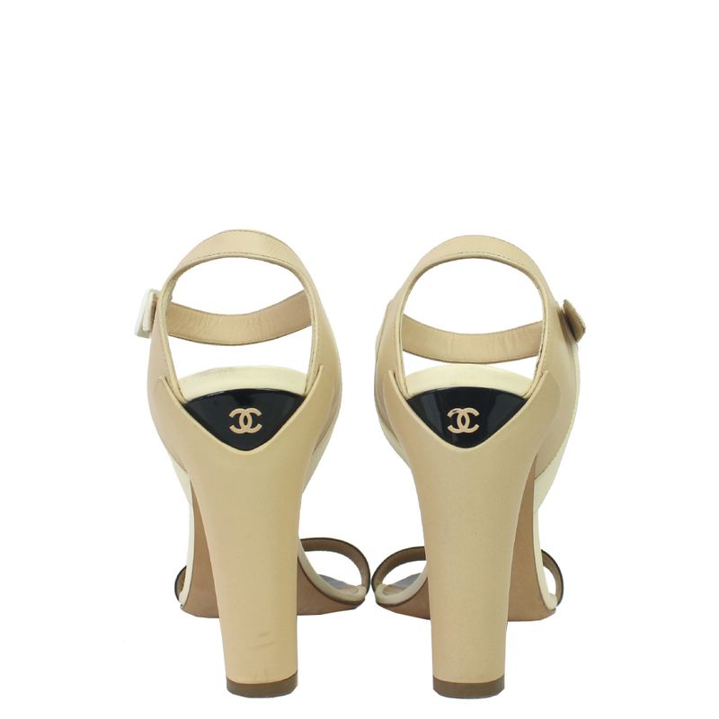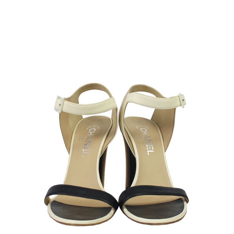 Sandália da marca Chanel, tamanho 38 1/2 sola, aproximadamente 36/37 Brasil, confeccionada em couro nude e preto. A sandália conta com salto de 11 centímetros e fecho por meio de fivela. Encontra-se em ótimo estado de conservação, com pequenas marcas de uso.