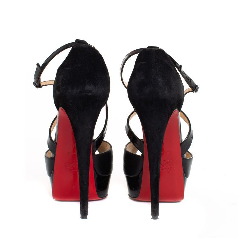Sandália da marca Christian Louboutin tamanho 40 sola, aproximadamente 39 no Brasil. Confeccionado em couro, verniz e camurça na cor preta. Possui salto alto de altura 15 cm e 3 cm meia pata Se encontra em ótimo estado de conservação, com desgastes nas solas.