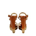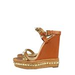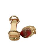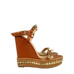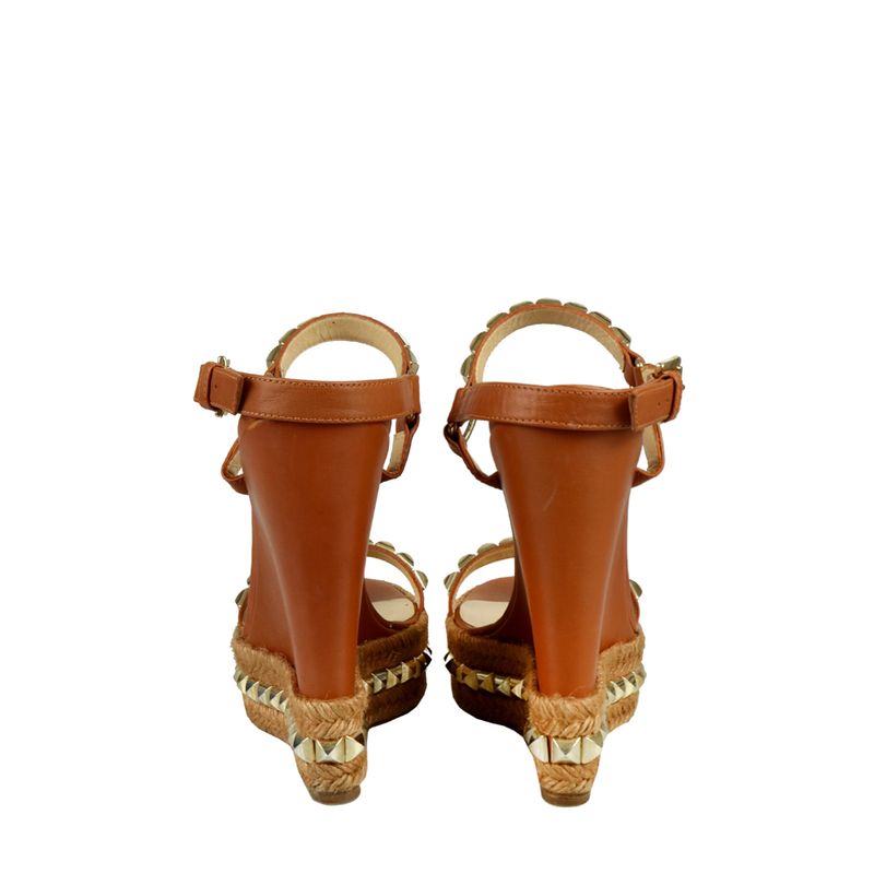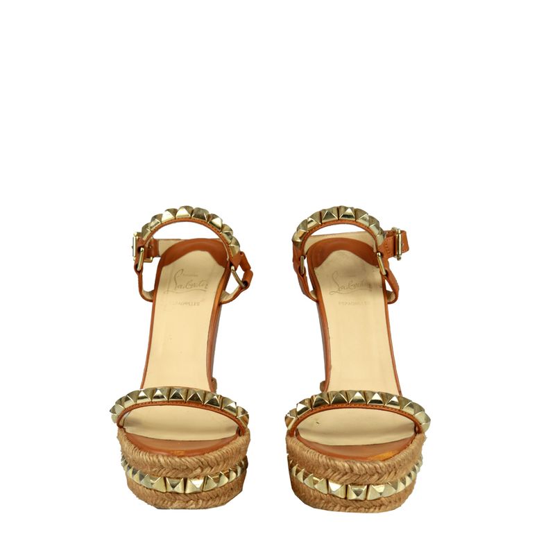 Sandália da marca Christian Louboutin, tamanho 41 sola, aproximadamente 38-39 BR, confeccianada em couro caramelo e spikes douradas. A sandália conta com salto de 15 cm e plataforma de 4 cm. Encontra-se em ótimo estado de conservação.