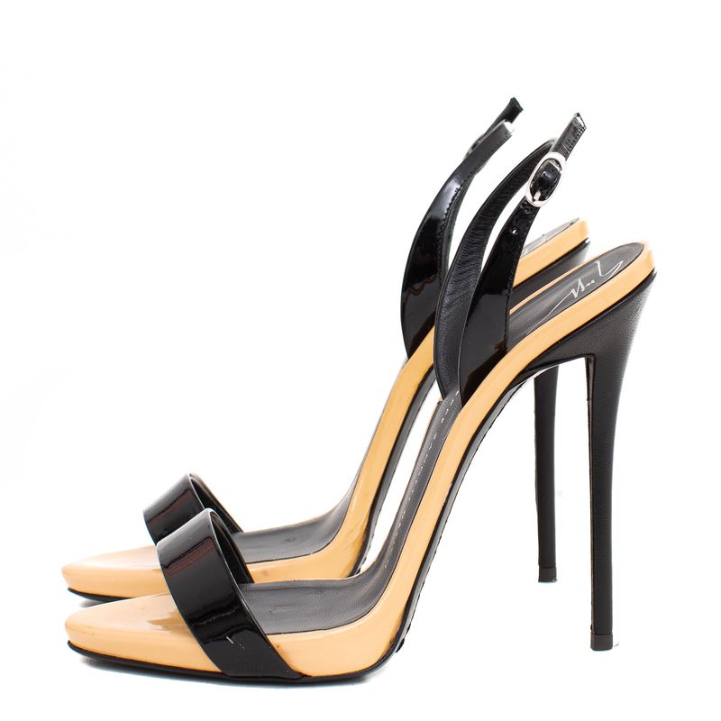 Sandália da marca Giuseppe Zanotti, tamanho 36 sola aproximadamente 34 Brasil. Confeccionado em verniz nas cores bege e preta e salto couro. Sandália contém salto de 12,5 cm altura. Encontra-se em ótimo estado de conservação, com leves manchinhas.