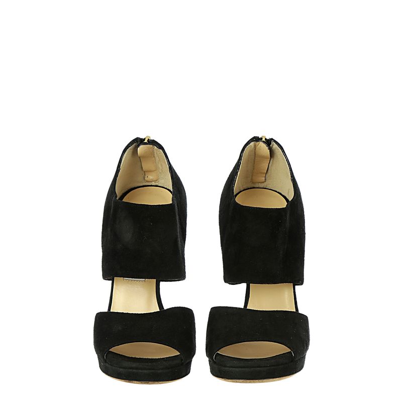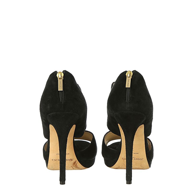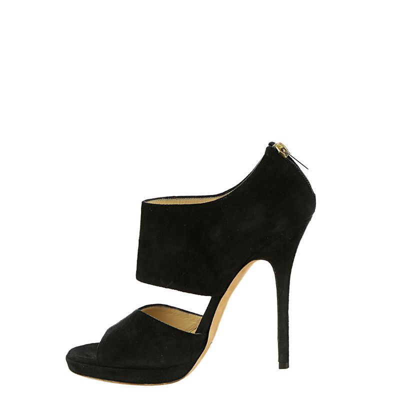 Sandália da marca Jimmy Choo. Confeccionada em camurça na cor preta, fecho por meio de zíper na parte de trás e ferragens douradas. A peça se encontra em ótimo estado, com leves marcas de uso.