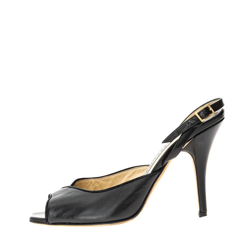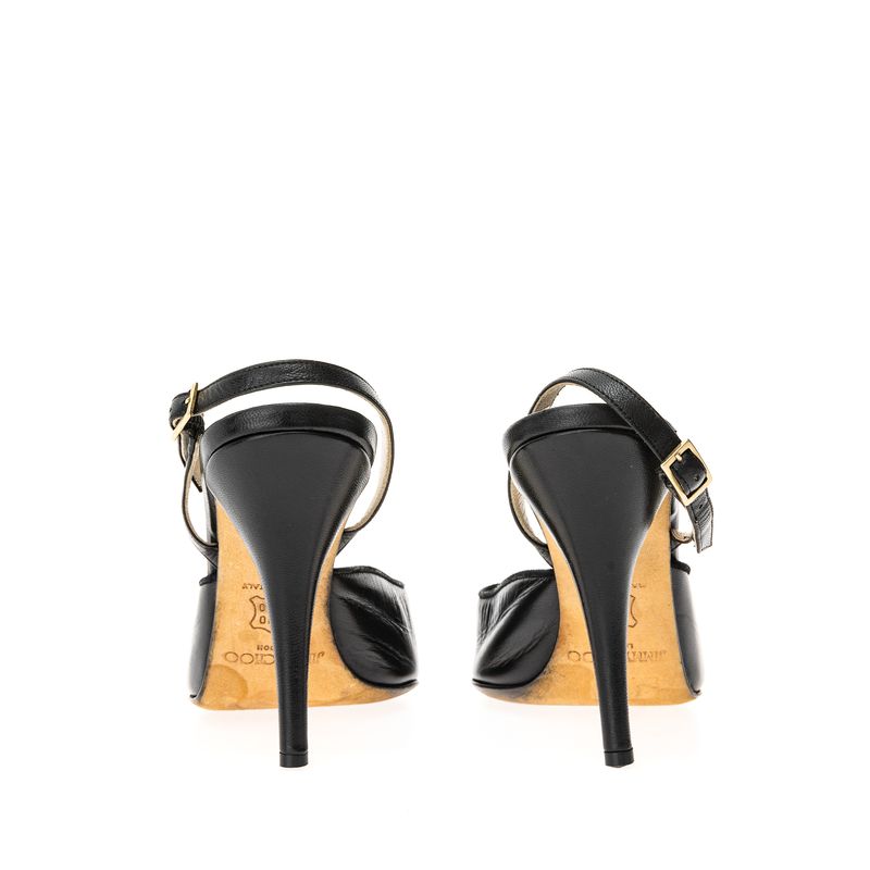 Sandália da marca Jimmy Choo. Confeccionado em couro preto, tira com fivela dourada e salto alto. A peça se encontra em bom estado, com leves marcas de uso nas solas.