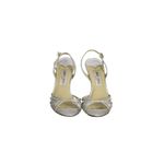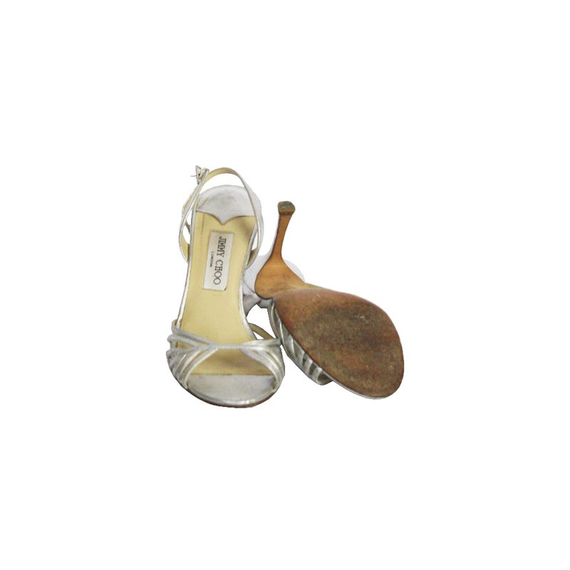 Sandália da marca Jimmy Choo tamanho 40 sola, aproximadamente 39 no Brasil. Confeccionado em couro prateado e detalhe com strass na fivela. Possui salto alto de altura 10cm. Se encontra em bom estado de conservação.
