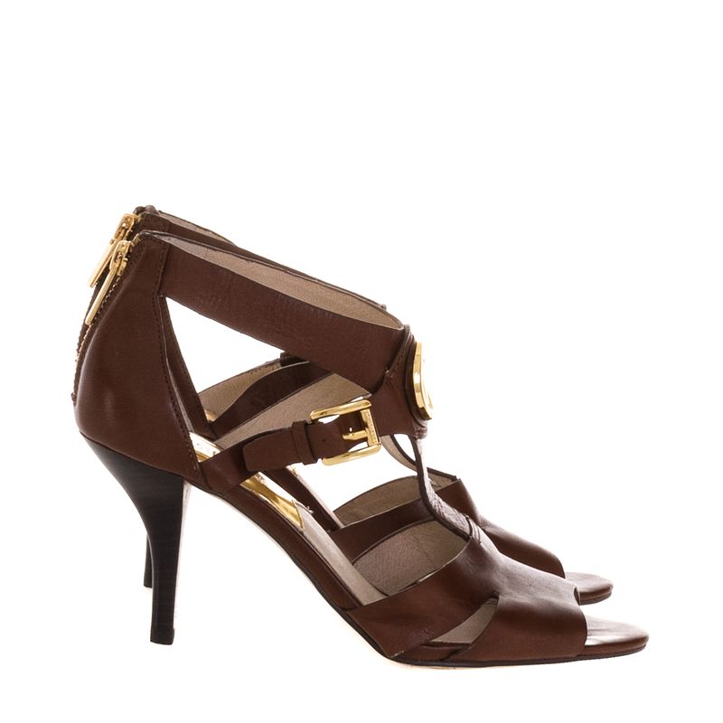 Sandália da Michael Kors. Confeccionada em couro na cor marrom e ferragens douradas. A sandália possui logo "MK" em metal na parte frontal, recortes ao longo do couro, fivela para ajuste lateral e fecho de zíper na parte de trás. A peça se encontra em excelente estado, muito bem conservada, com levíssimos desgastes ao longo do couro e do solado.