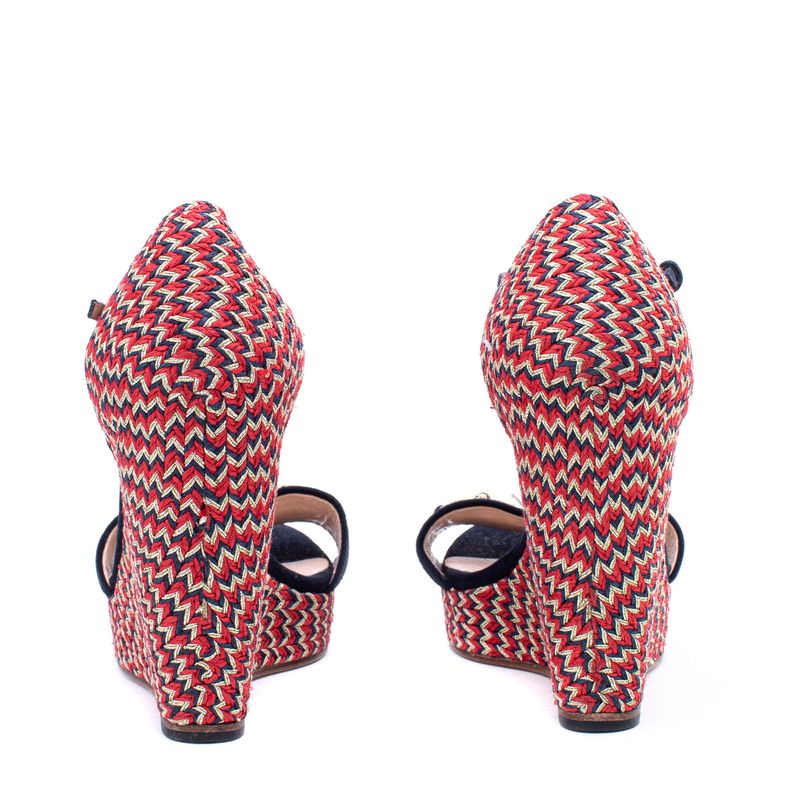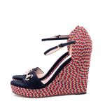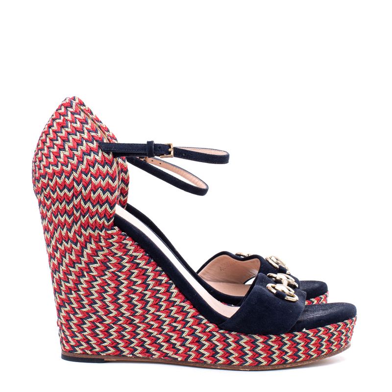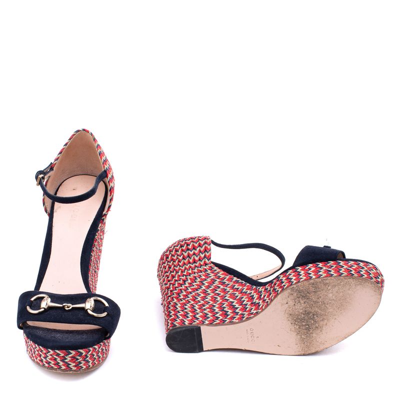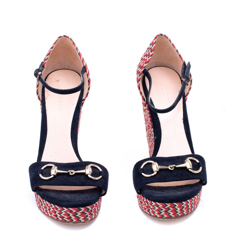 Sandália da marca Gucci, tamanho 38 sola, aproximadamente 36 Brasil. Confeccionada em camurça azul marinho com salto trançado nas cores vermelho, dourado e azul. Possui salto de 12 cm de altura. Encontra-se em ótimo estado de conservação, com desgastes nas solas. Possui dust.