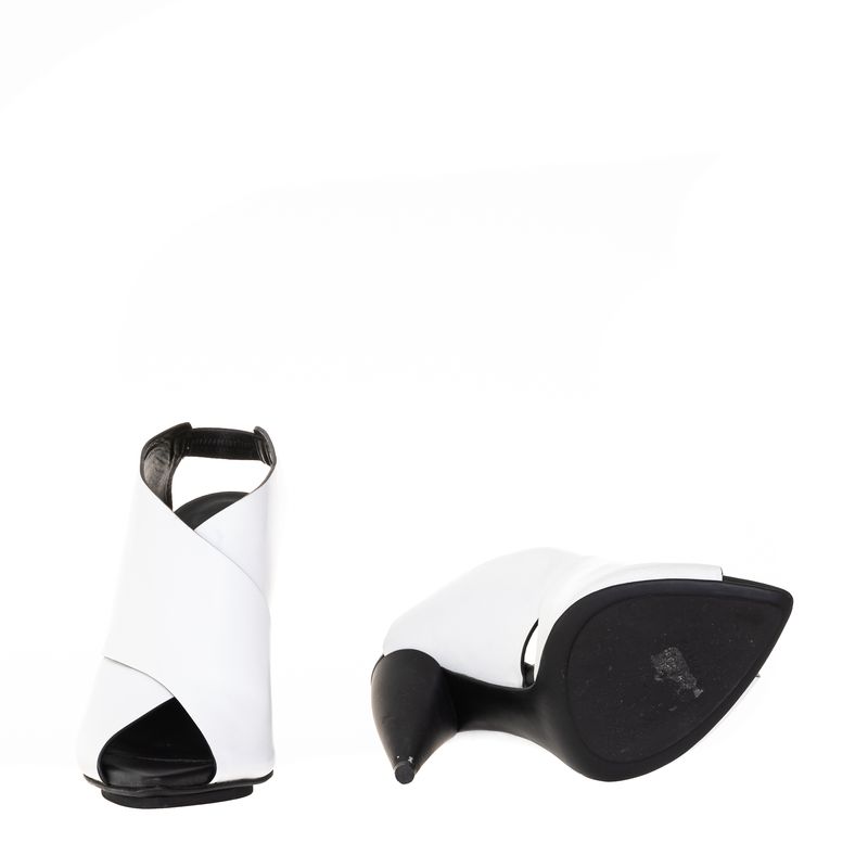 Sandália da marca Proenza Schouler. Confeccionada em couro na cor branca e salto em borracha na cor preta. Modelo de salto alto, abertura no bico e elástico na parte posterior. A peça se encontra em excelente estado, muito bem conservada, com leves marcas pretas no couro branco e alguns pequenos desgastes no salto.