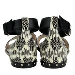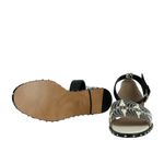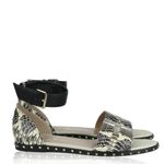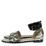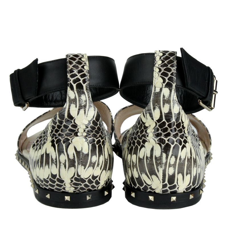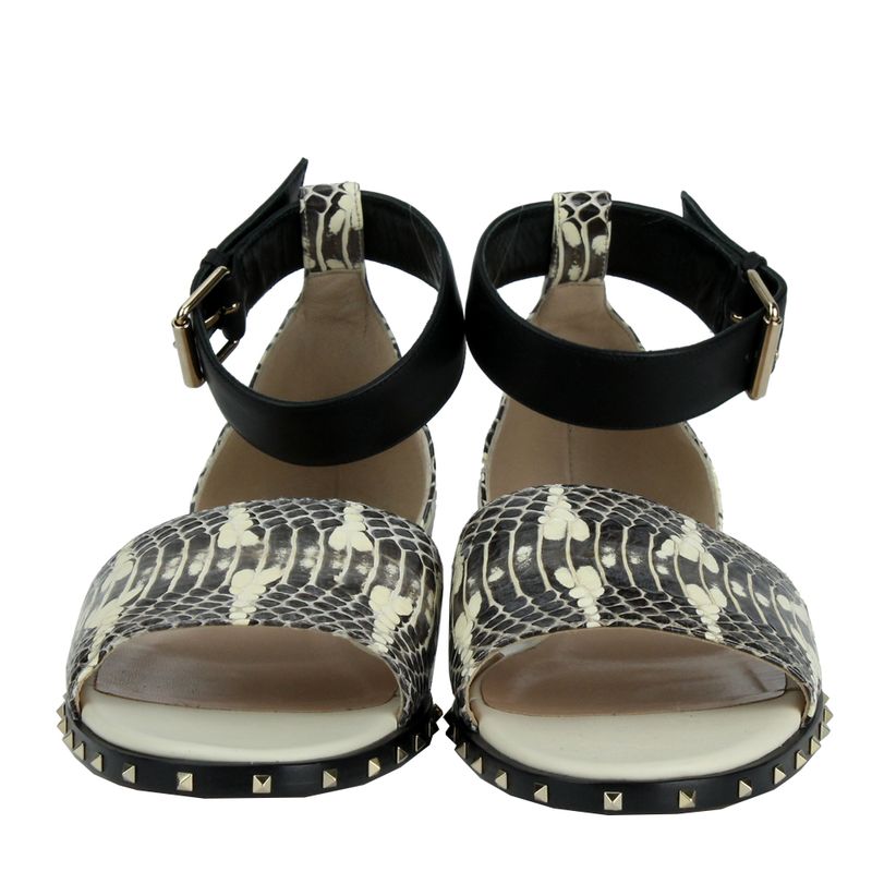 Sandália rasteira da marca Valentino, tamanho 39 1/2 sola, aproximadamente 38-39 Brasil, confeccionada em python em tons de cinza e creme. Possui tornozeleira em couro preto com fecho por meio de fivela e tachinhas em metal dourado aplicadas ao redor da sola. Encontra-se em perfeito estado de conservação, nunca usada.