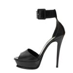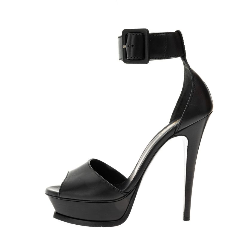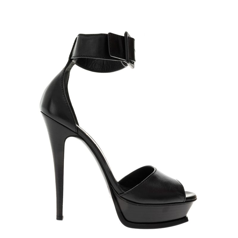 Sandália Saint Laurent, confeccionado em couro preto, fechamento por tira com fivela larga. A peça se encontra em ótimo estado, com leves marcas de uso.