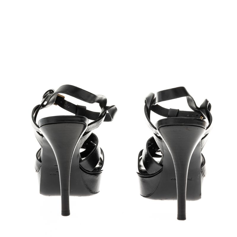 Sandália da marca Yves Saint Laurent. Confeccionado em couro preto e fecho na parte lateral de fivela em material dourado. A peça se encontra em estado satisfatório, com marcas de uso aparentes nas solas, riscos no couro.