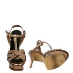 Sandália da marca Saint Laurent, modelo Tribute. Confeccionada em couro na cor dourada e fecho na parte lateral de fivela em material dourado. Acompanha caixa. A peça se encontra em ótimo estado, com leves marcas de uso no salto e na sola.