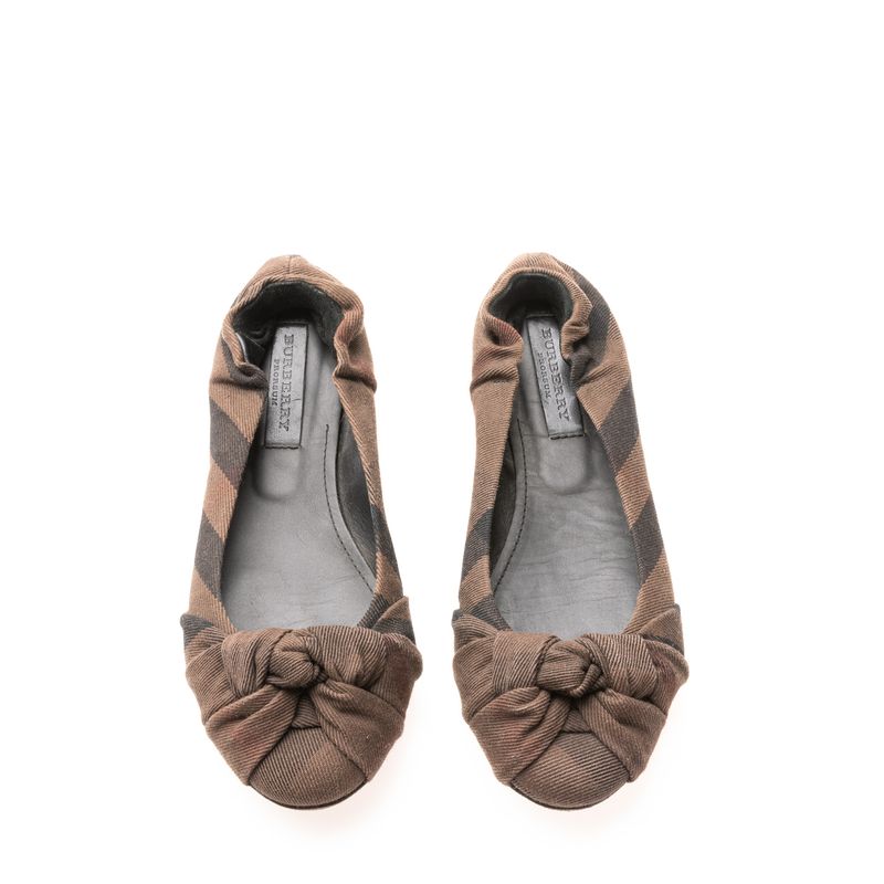 Sapatilha da marca Burberry, tamanho sola 38 1/2 aproximadamente 36,5 Brasil. Confeccionado em tecido marrom xadrez, com elástico no calcanhar. A peça se encontra em estado satisfatório, com leves marcas de uso aparentes.