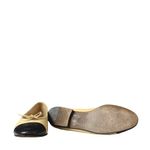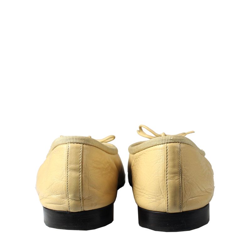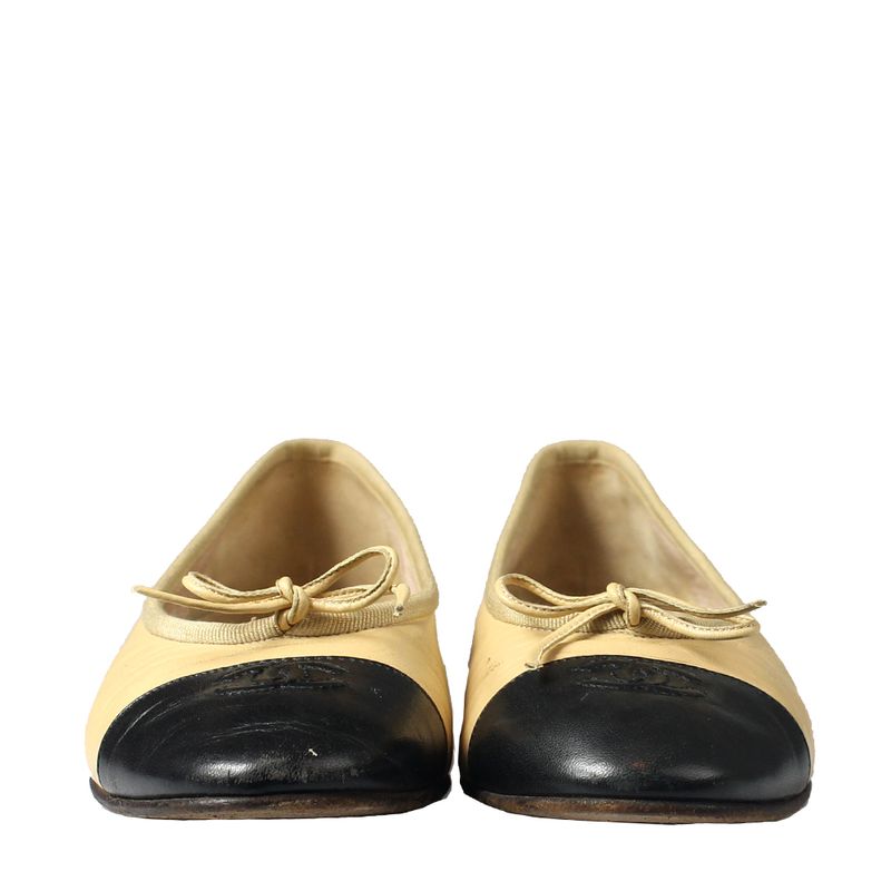 Sapatilha da marca Chanel, tamanho 36 1/2 sola, aproximadamente 34-35 BR, confeccionada em couro nude com o bico em couro preto. A sapatilha conta com saltinho de 1,5 cm e encontra-se em ótimo estado de conservação, com leves desgastes na parte da frente.