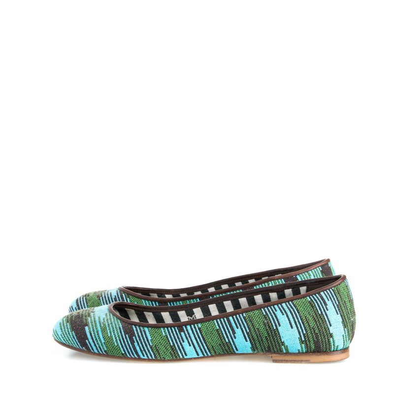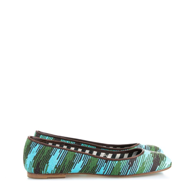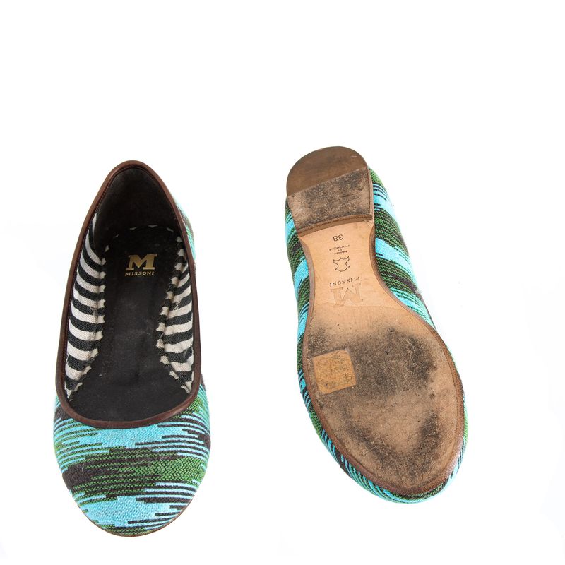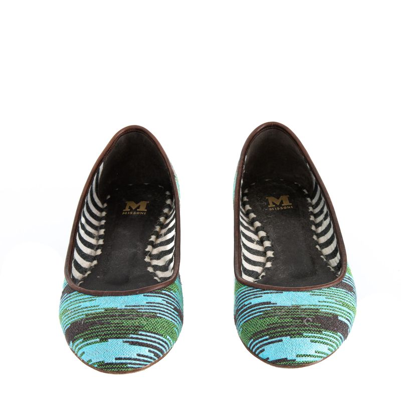 Sapatilha da marca Missoni, tamanho sola 38 aproximadamente 36 Brasil. Confeccionado em tecido estampado, com acabamento em couro marrom e bico redondo. Encontra-se ótimo estado de conserção, com desgastes nas solas.