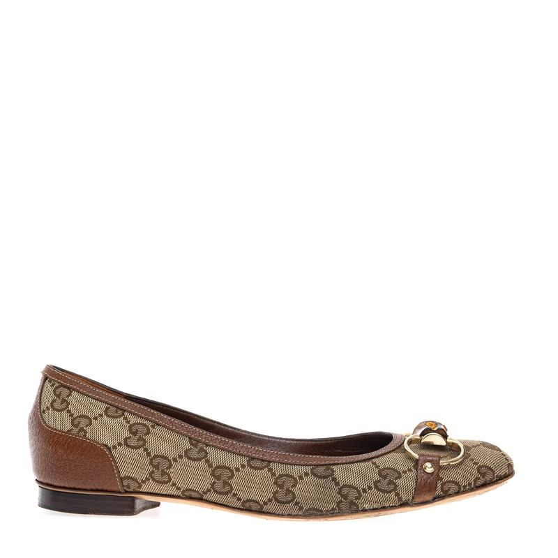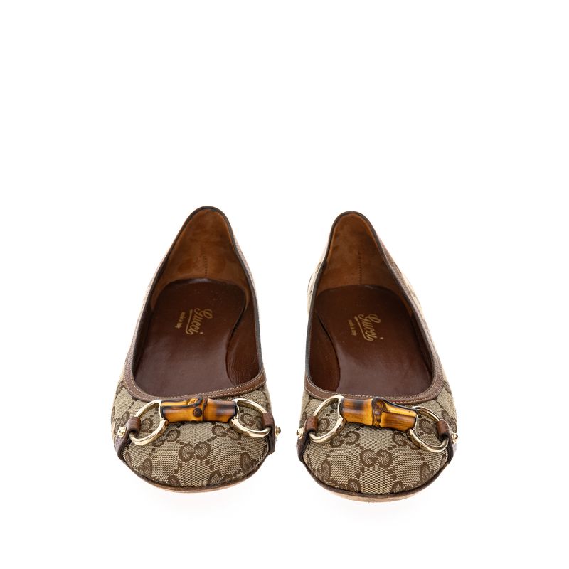Sapatilha da marca Gucci. Confeccionada em couro caramelo, jacquard na estampa GG Supreme, horsebit em metal prateado e detalhe de bambu. A peça se encontra em estado satisfatório, com leves marcas de uso aparentes, material em ótimo estado, porém marquinha entre solado e sapato devido reparo.