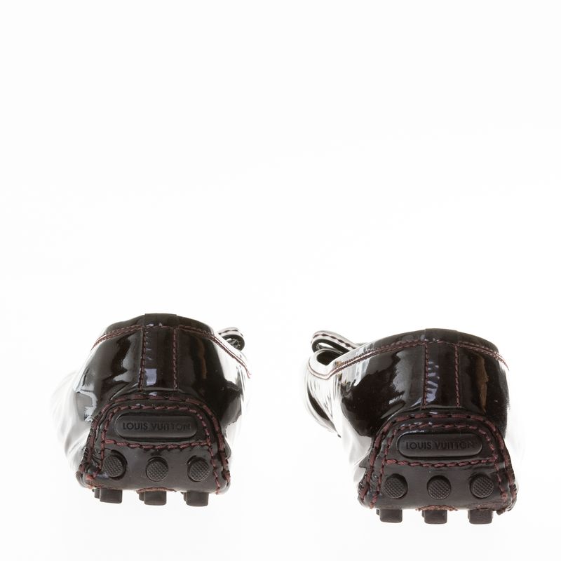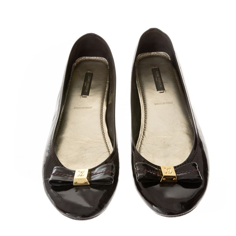 Sapatilha da marca Louis Vuitton, tamanho sola 40 aproximadamente 38,5 Brasil. Confeccionado em verniz na cor vinho, com laço e placa de metal LV gravado. A peça se encontra em bom estado, com leves marcas de uso.