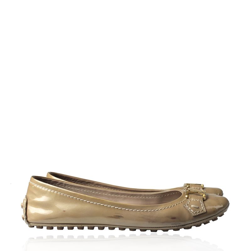 Sapatilha da marca Louis Vuitton, tamanho 36 sola, aproximadamente 34-35 BR, confeccionada em verniz nude levemente cintilante com o solado emborrachado. Encontra-se em ótimo estado de conservação, com leves marcas no verniz e marcas de uso.