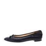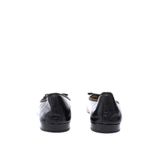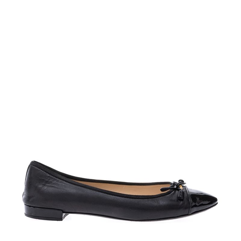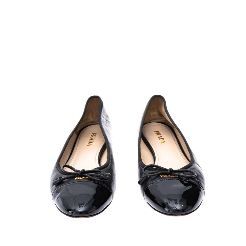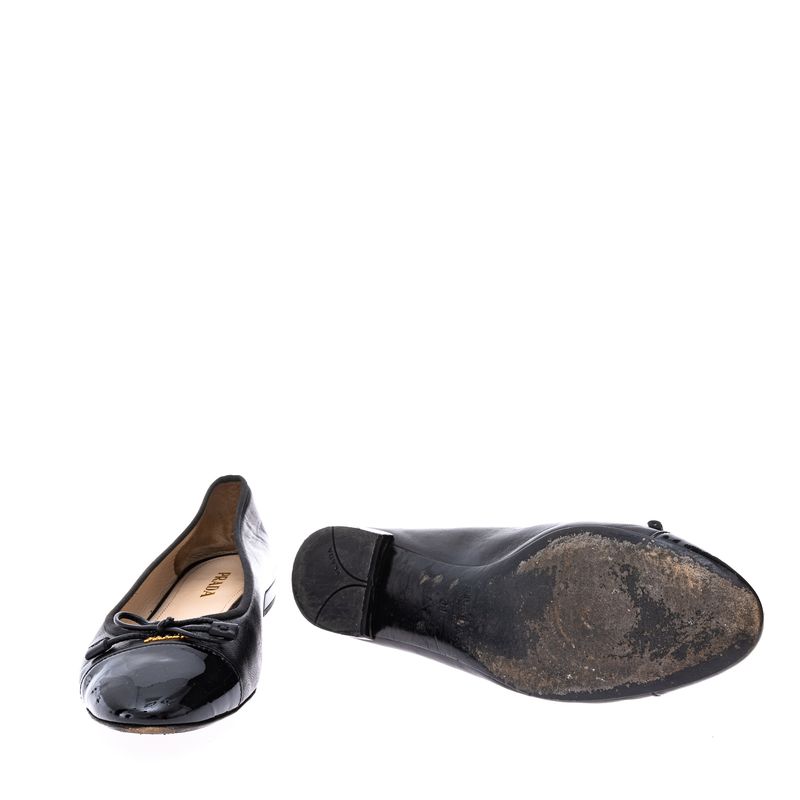 Sapatilha da marca Prada. Confeccionada em couro preto, bico redondo em verniz, possui um lacinho e nome frontal dourado. A peça se encontra em estado satisfatório, com leves marcas de uso aparentes nas solas.