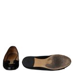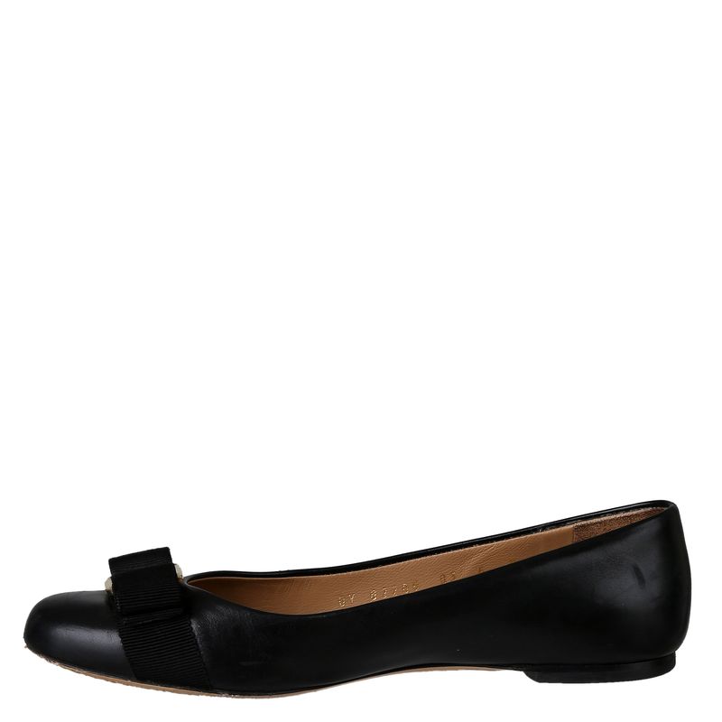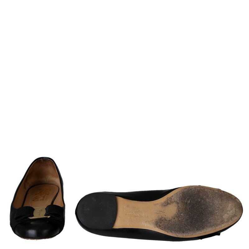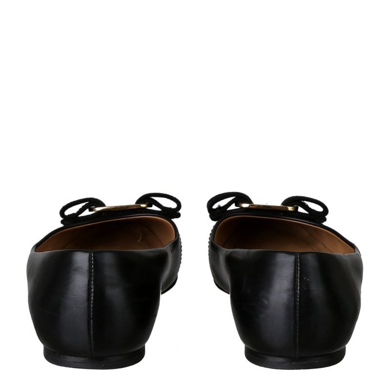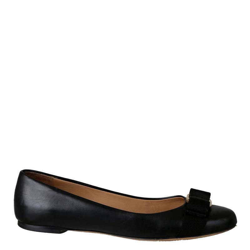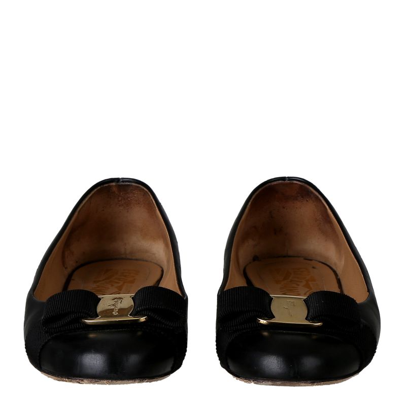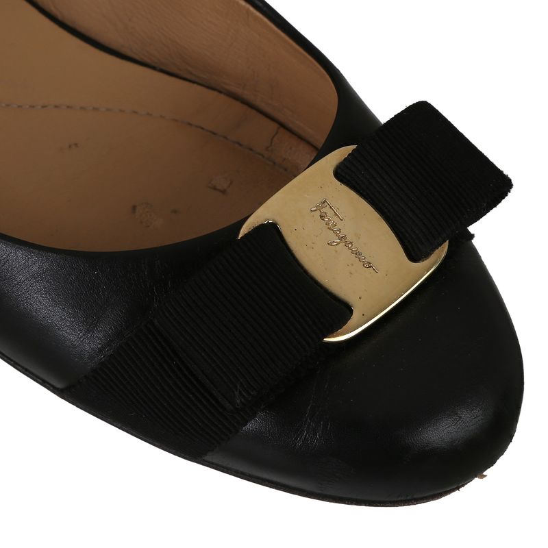 Sapatilha da marca Salvatore Ferragamo. Confeccionada em couro na cor preta. Possui bico arredondado e detalhe frontal de laçoa em tecido. A peça se encontra em estado satisfatório, com leves marcas de uso aparentes principalmente na parte interna.
