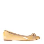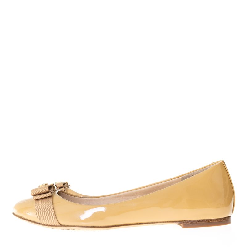 Sapatilha da marca Tory Burch. Confeccionado em verniz na cor bege, detalhe frontal fita de gorgurão com logo da marca em metal dourado. A peça se encontra em excelente estado, muito bem conservada.