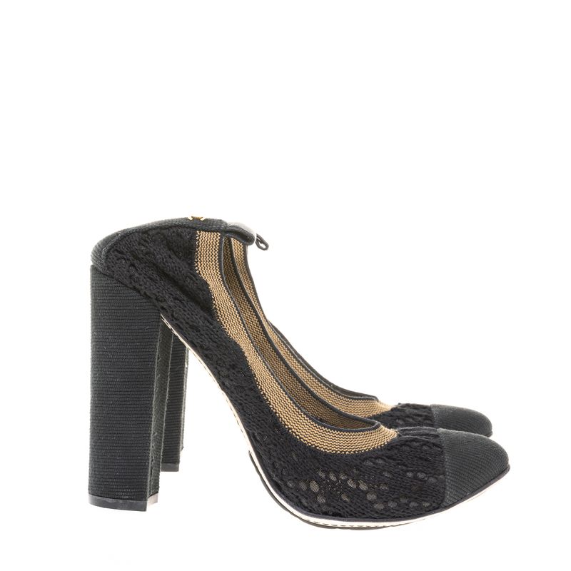 Sapato de salto da marca Chanel. Confeccionado em croché na cor preta. O modelo possui salto grosso, bico redondo, e bordas de elástico na cor bege e preto. A peça se encontra em estado satisfatório, com leves marcas de uso aparentes.