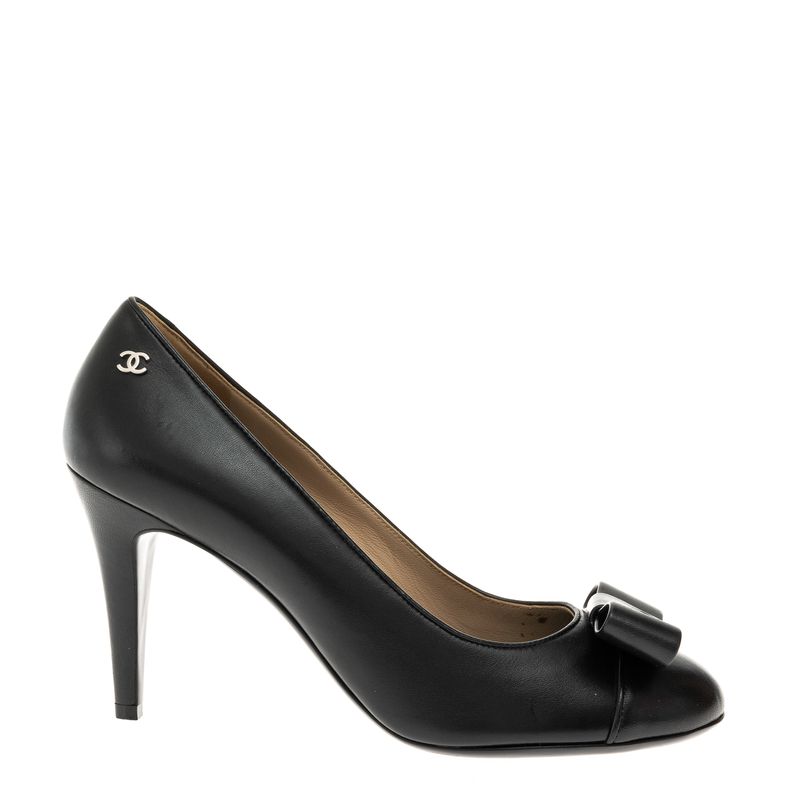 Sapato de Salto Chanel, confeccionado em couro preto, laço frontal, bico arredondado. A peça se encontra em ótimo estado, com leves marcas de uso.