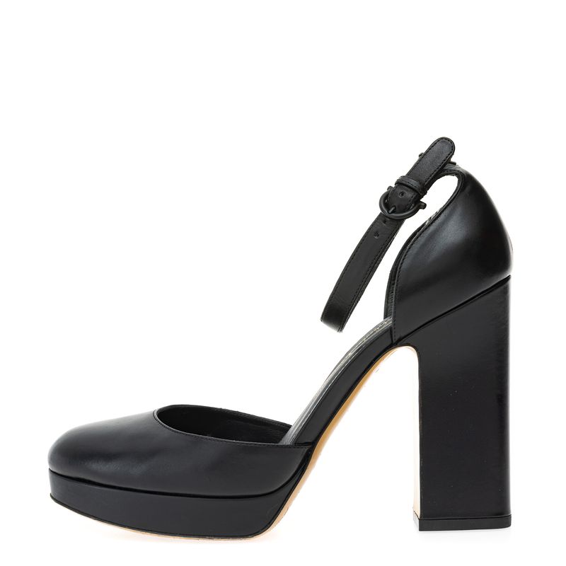 Sapato de Salto da marca Salvatore Ferragamo. Confeccionado em couro preto, bico redondo, fechamento por faixa com fivela, salto bloco. A peça se encontra em ótimo estado, com levíssimas marcas de uso.