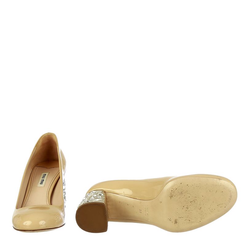 Sapato da marca Miu Miu. Confeccionado em verniz na cor bege. O sapato possui bico arredondado e salto com acabamento metalizado e aplicação de pedrarias. Não possui fecho. A peça se encontra em estado satisfatório, com leves marcas de uso aparentes principalmente no verniz.