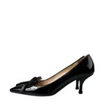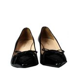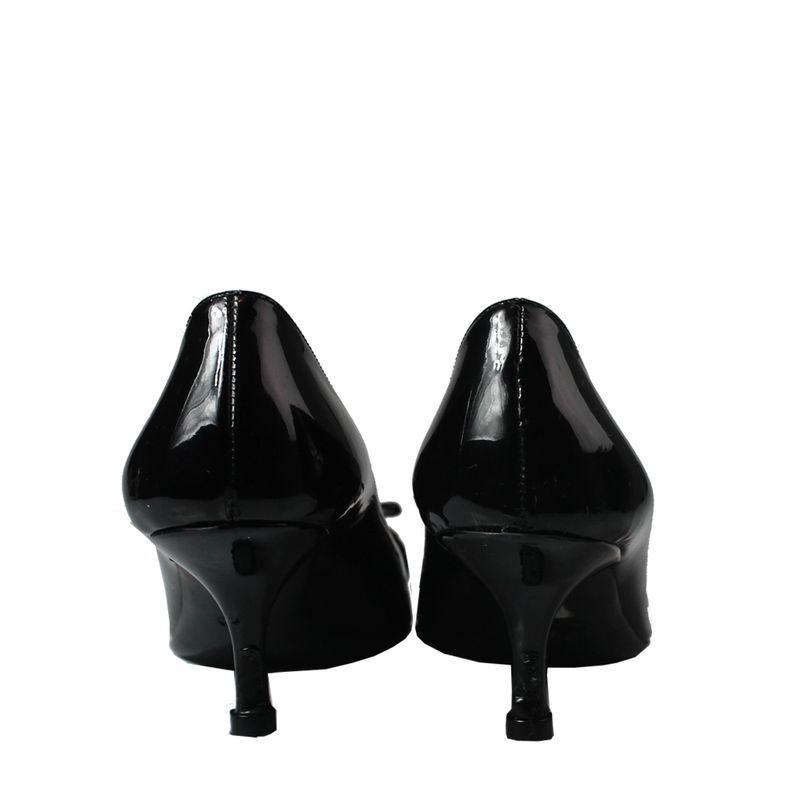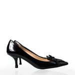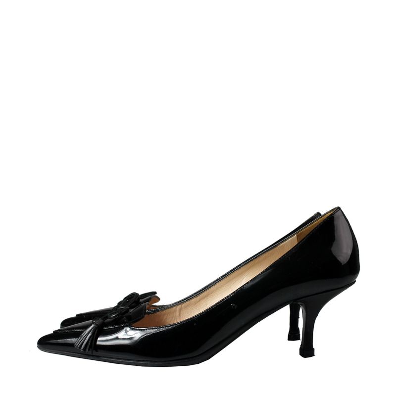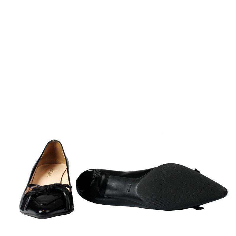 Sapato da marca Prada, tamanho 34-35 BR, confeccionado em verniz preto. O sapato possui salto fino de 5 cm e detalhe de laço em couro na parte da frente.