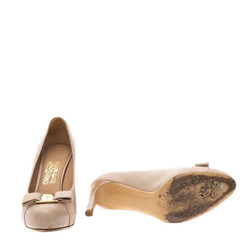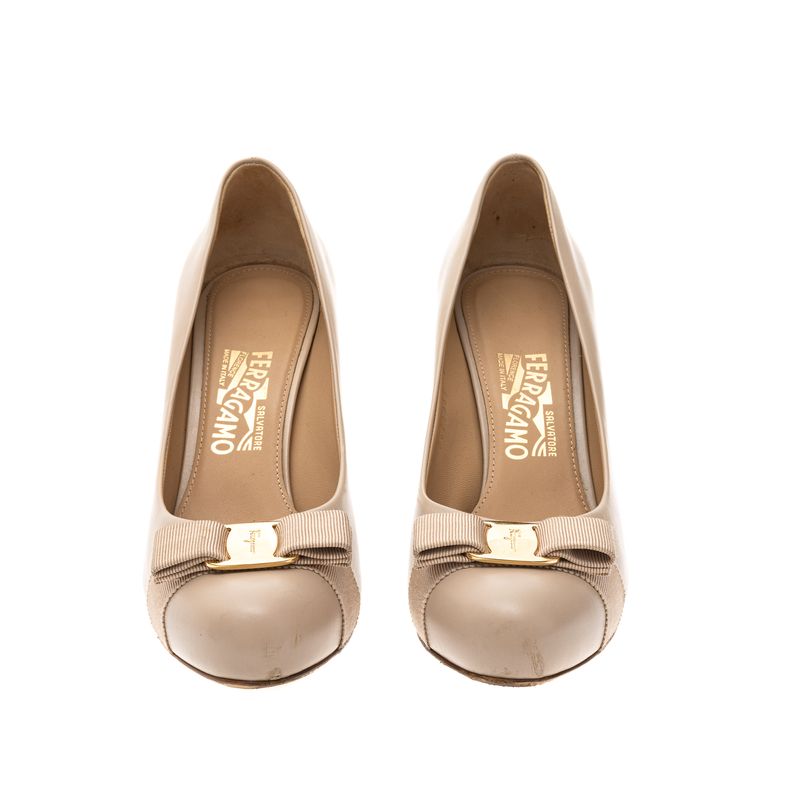 Scarpin da marca Salvatore Ferragamo. Confeccionado em couri na cor bege, salto em material estilo madeira e laço de gorgurão na ponta. A peça se encontra em estado satisfatório, com leves marcas de uso aparentes, alguns desgastes ao longo do couro e do salto.
