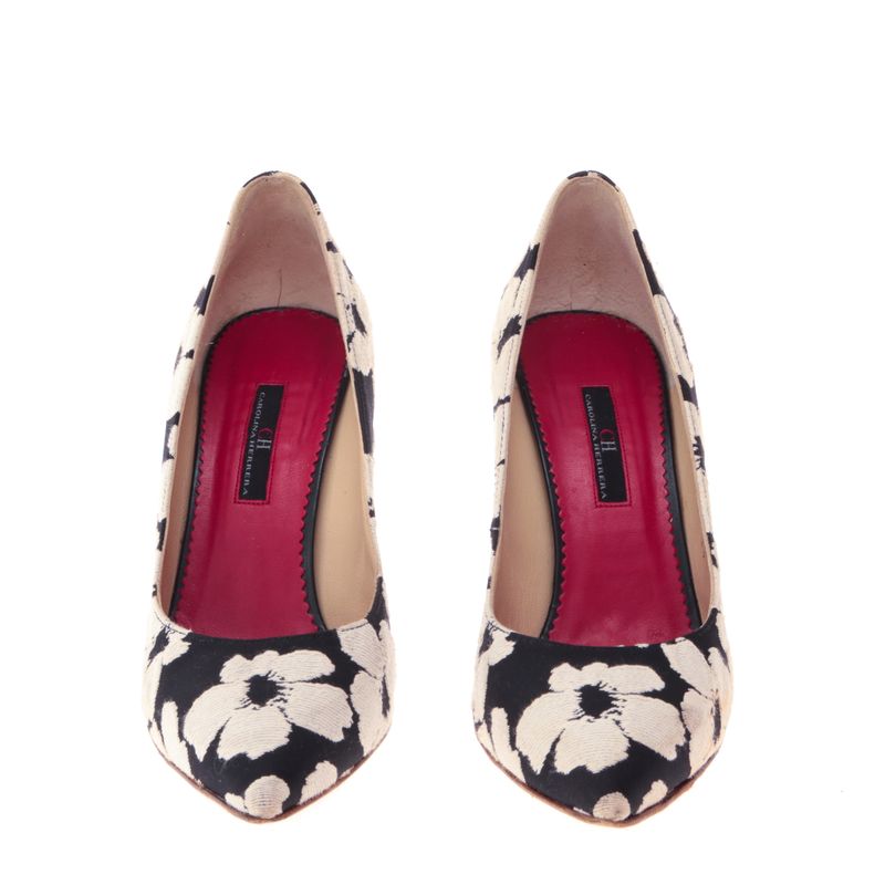 Scarpin da marca Carolina Herrera. Confeccionado em tecido preto com estampa de flores, salto fino de couro. A peça se encontra em estado satisfatório, com mancha no tecido, em um dos saltos com lascadinho.