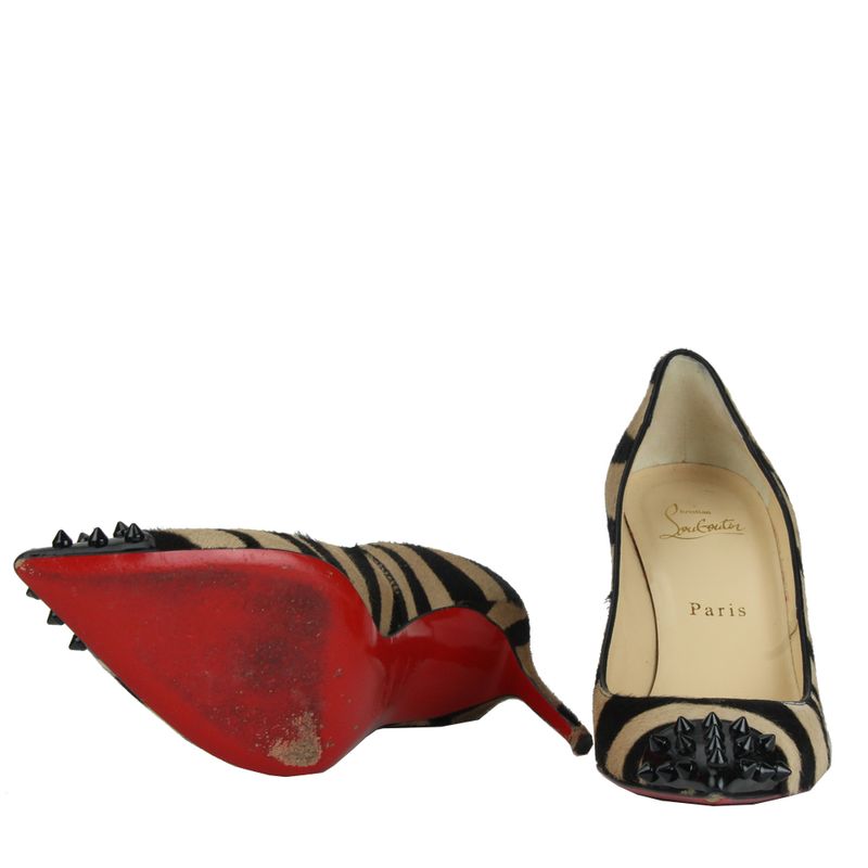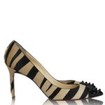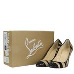 Scarpin da marca Christian Louboutin, tamanho 36 1/2 sola, aproximadamente 34-35 Brasil, confeccionado em pelo com animal print em bege e preto. Conta com bico em verniz preto com spikes pretos e salto médio de 8 cm. Encontra-se em excelente estado de conservação, com sinais de uso na sola.