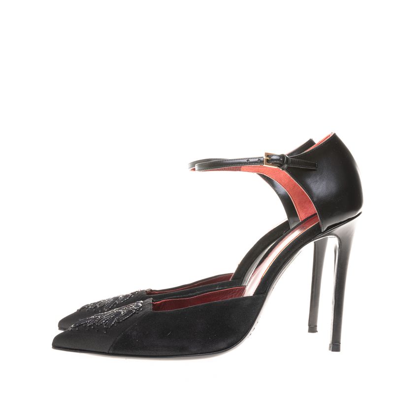 Scarpin da marca Etro. Confeccionado em camurça nas laterias, calcanhar e salto em couro, bico em seda com detalhe de bordado. Fecho por tira com fivela. A peça se encontra em excelente estado, muito bem conservada.
