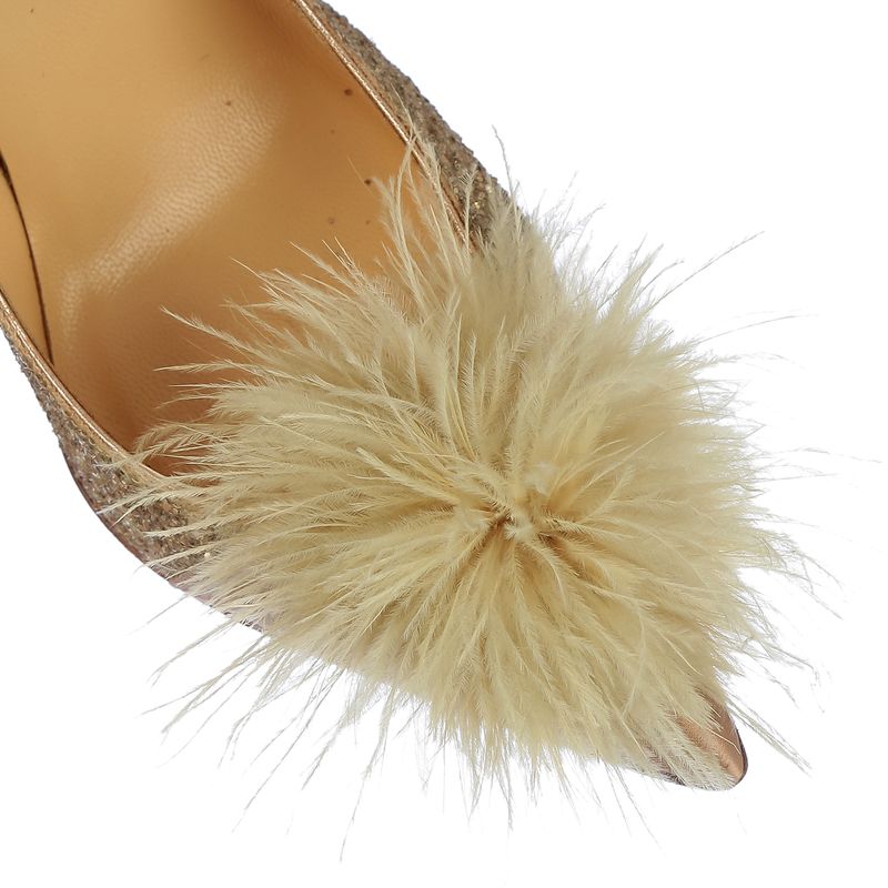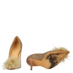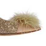 Scarpin da marca Kate Spade. Confeccionado em glitter e cetim rosa com pom pom na parte da frente. A peça apresenta marcas de uso e desgastes.