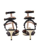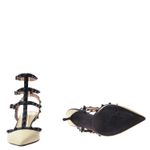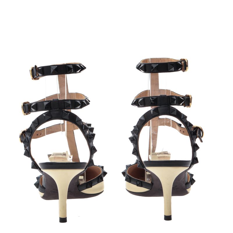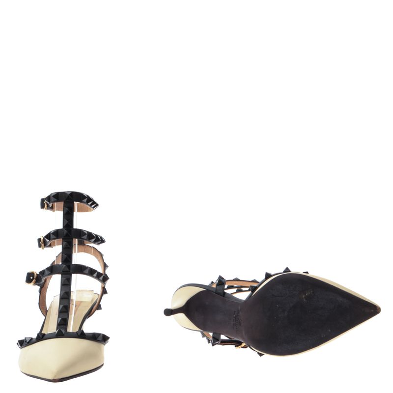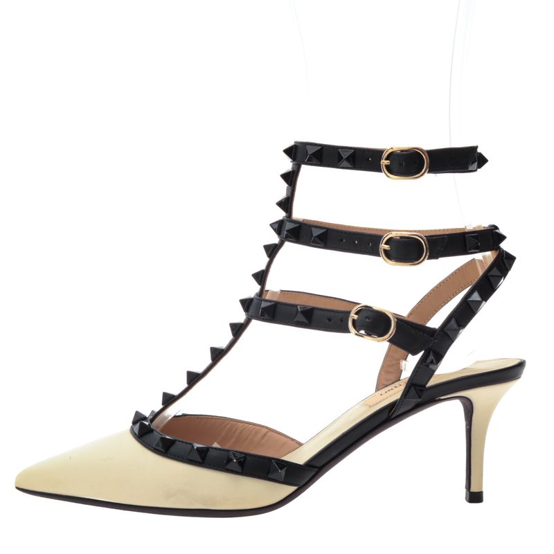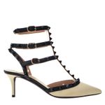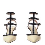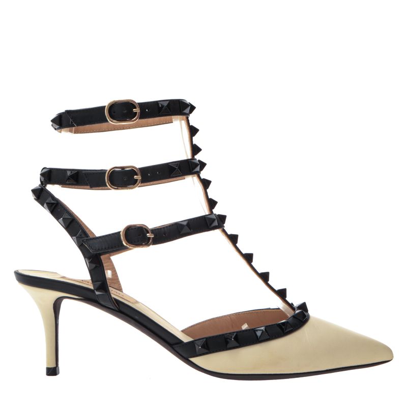 Scarpin da marca Valentino Garavani Rockstud. Confeccionado em couro na cor creme com acabamento preto, tachas pretas e fecho por fivelas. A peça se encontra em bom estado, com leves marcas de uso nos bicos e solado.