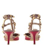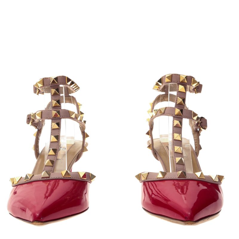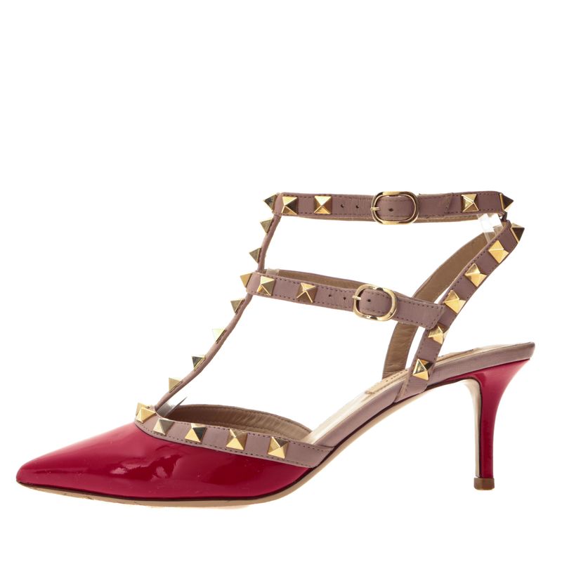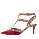 Scarpin da marca Valentino Garavani Rockstud. Confeccionado em couro envernizado vermelho com acabamento de couro rose, tachas douradas e fecho por fivelas. A peça se encontra em ótimo estado, com leves marcas de uso nos bicos e solado.