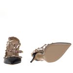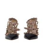 Scarpin da marca Valentino Rockstud. Confeccionado em couro preto com bege, aplicações tachas Rockstud douradas, bico fino, recortes sobrepostos, fechamento por fivelas e salto fino. Peça nova, encontra-se em perfeito estado.