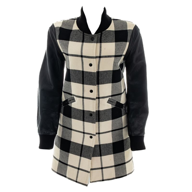 FemininoRoupasCasacos e JaquetasSobretudo Sandro Xadrez Lã e Couro Preto e Branco