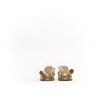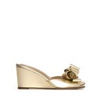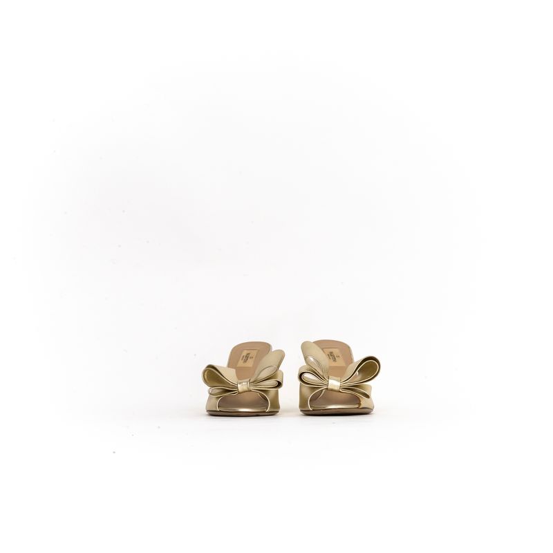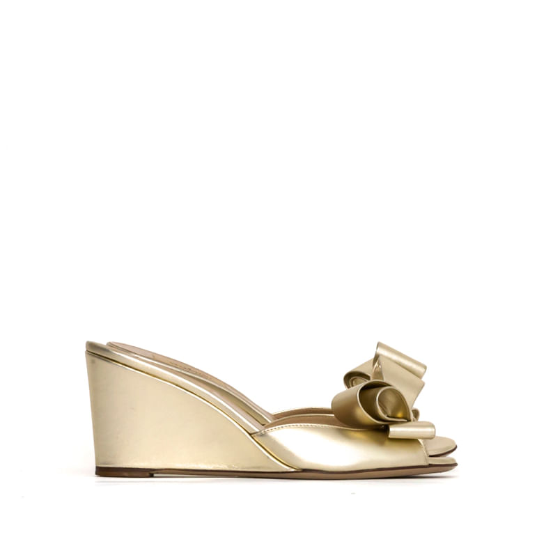 Tamanco da marca Valentino, tamanho 37 sola, aproximadamente 35 Brasil, confeccionado em couro na cor dourado. O sapato conta com salto anabela de 8 cm de altura e laço clássico da marca na parte frontal. Encontra-se em excelente estado de conservação, com leves arranhões.