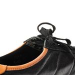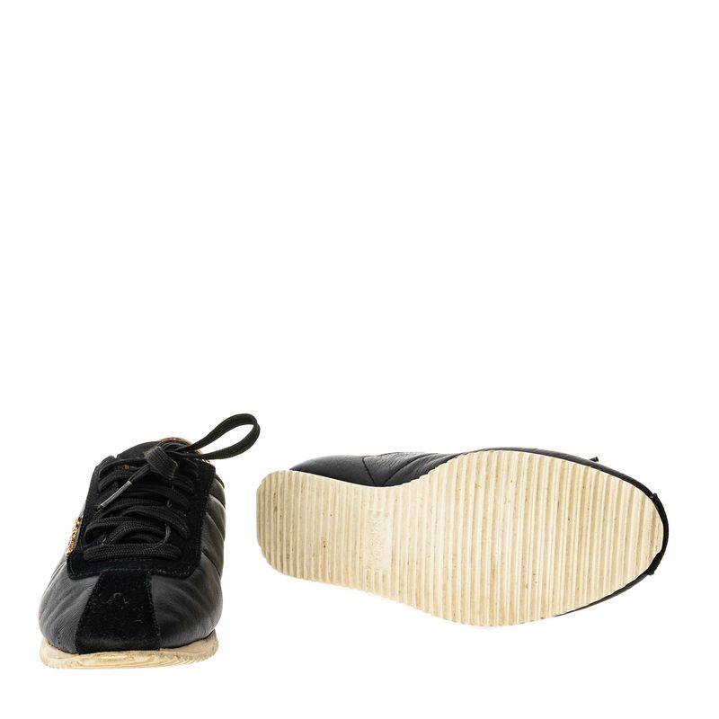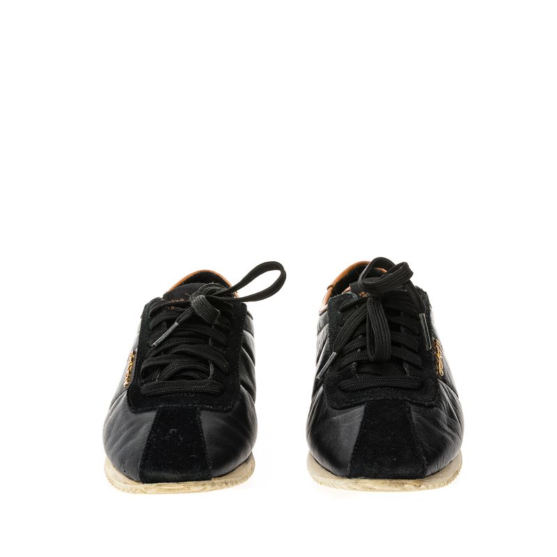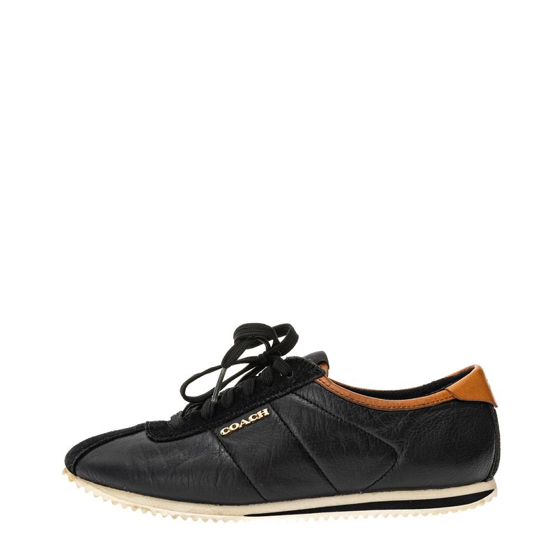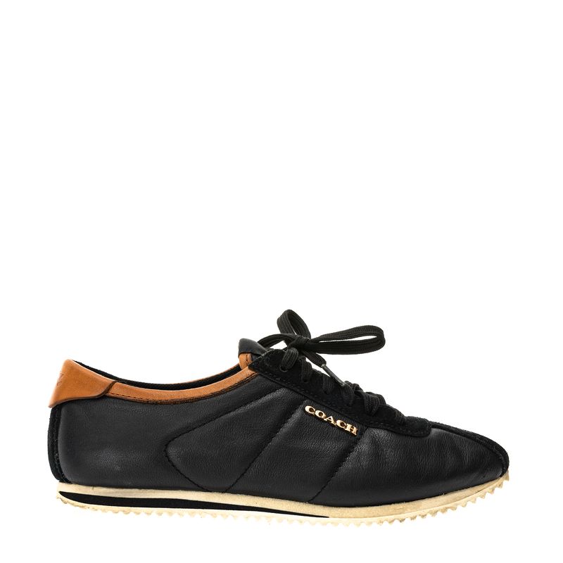 Tênis da marca Coach. Confeccionado em couro preto, detalhes de couro caramelo e camurça, solado de borracha e fechemento por amarração. A peça apresenta marcas de uso nas solas, couro sintético interno descascando.