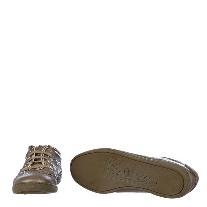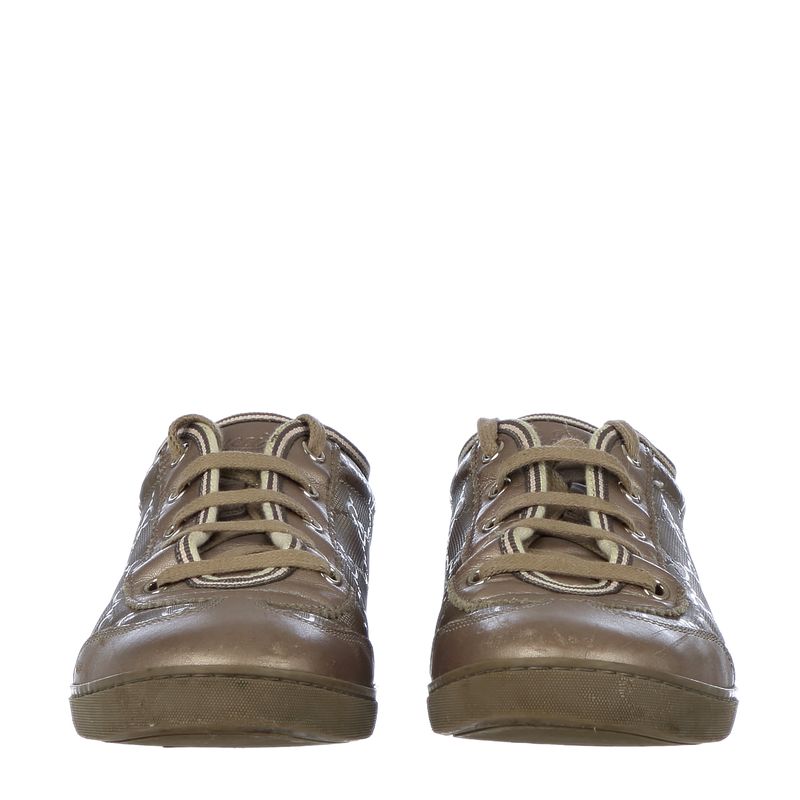 Tênis da marca Gucci. Confeccionado em couro metalizado na cor roxa. O tênis possui estampa com o monograma GG e sola emborrachada. A peça apresenta marcas de uso e desgastes.
