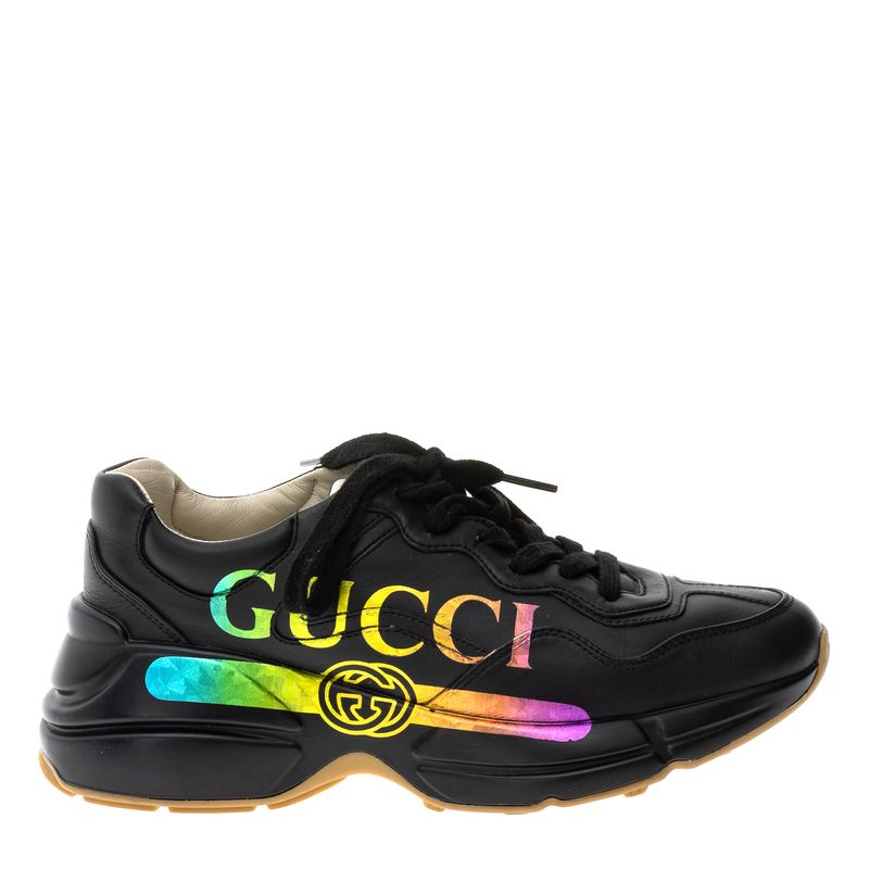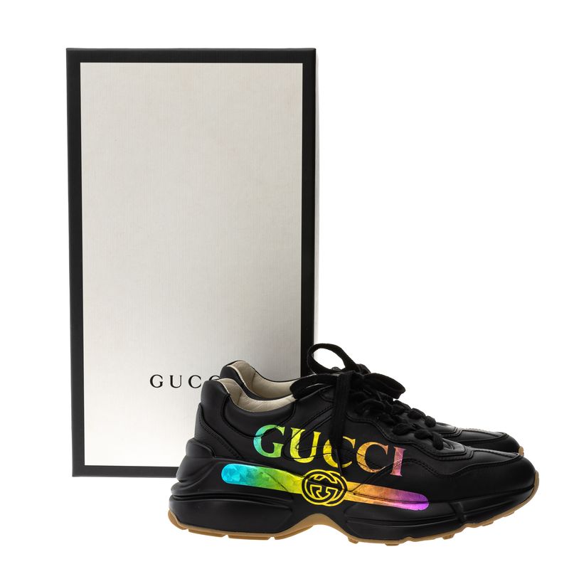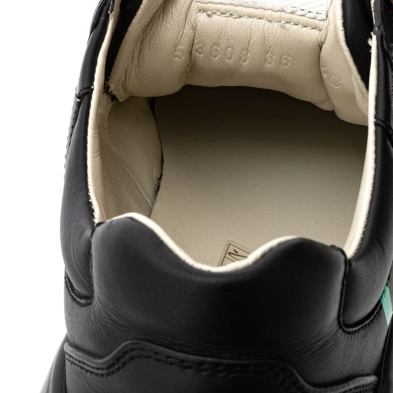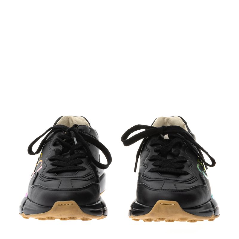 Tênis da marca Gucci, modelo Rhyton. Confeccionado em couro preto, possui logo multicolorido inspirado nos anos 1980. Solado de borracha e fechamento por amarração. A peça se encontra em excelente estado, muito bem conservada.