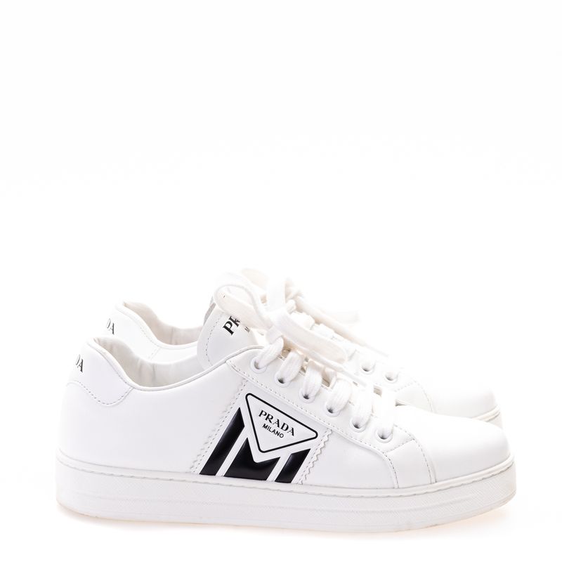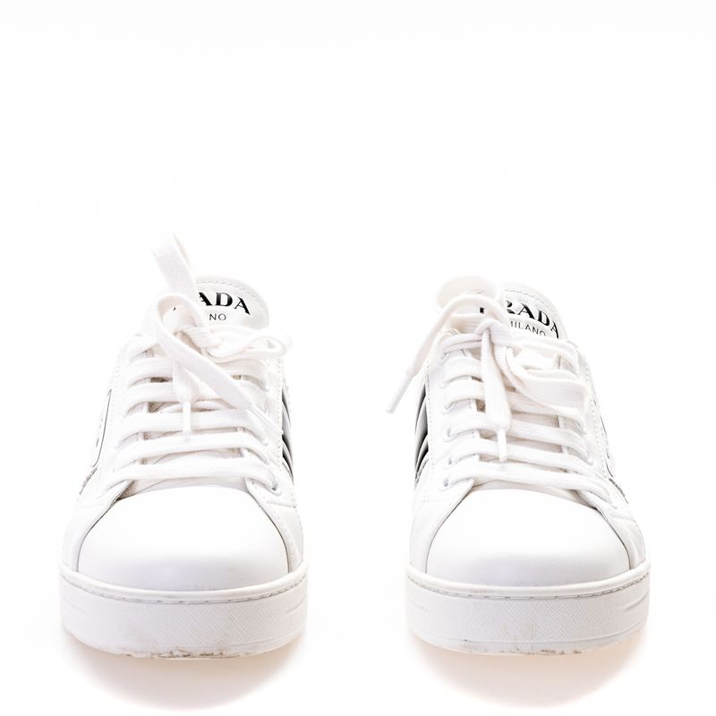 Tenis da marca Prada, tamanho 36 1/2 sola aproximadamente 34/35 Brasil. Confeccionado em couro na cor branca com listras preta e fecho por cadarço. A peça se encontra em excelente estado, muito bem conservada.