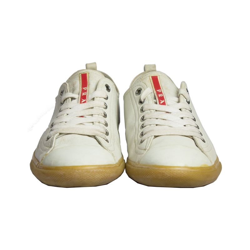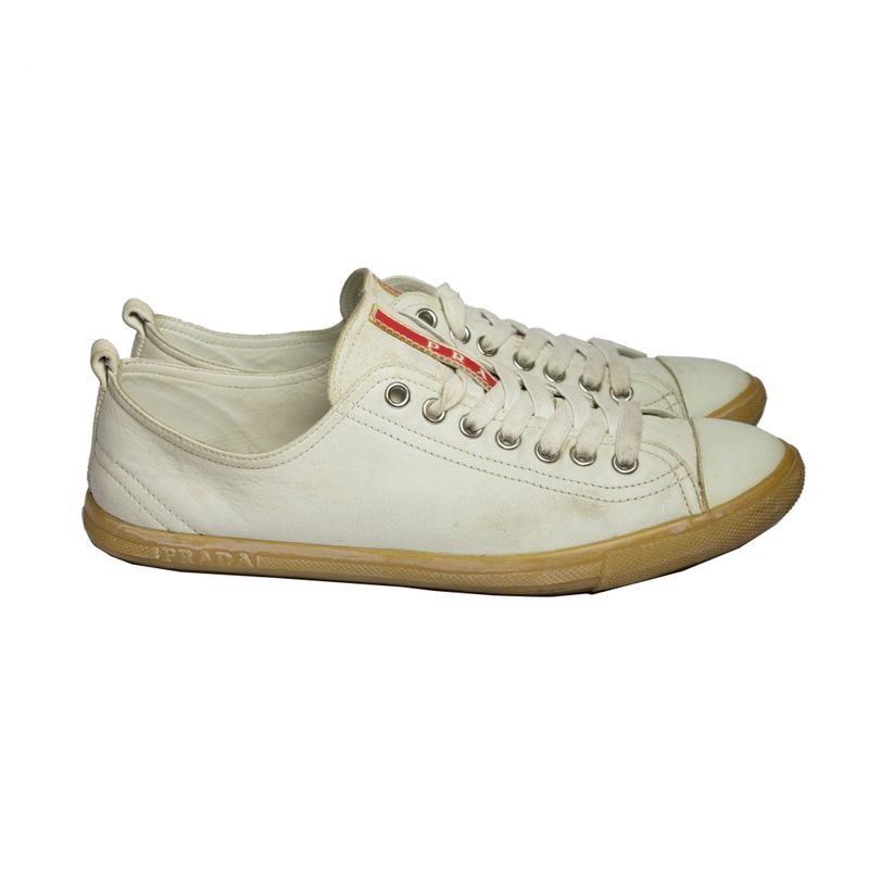 Tênis da marca Prada tamanho 38-39 Brasil. Confeccionado em couro branco, com solado de borracha bege, cadarço branco e etiqueta vermelha de borracha com o nome da marca. Se encontra em bom estado de conservação, com cadarço levemente encardido e couro desgastado.